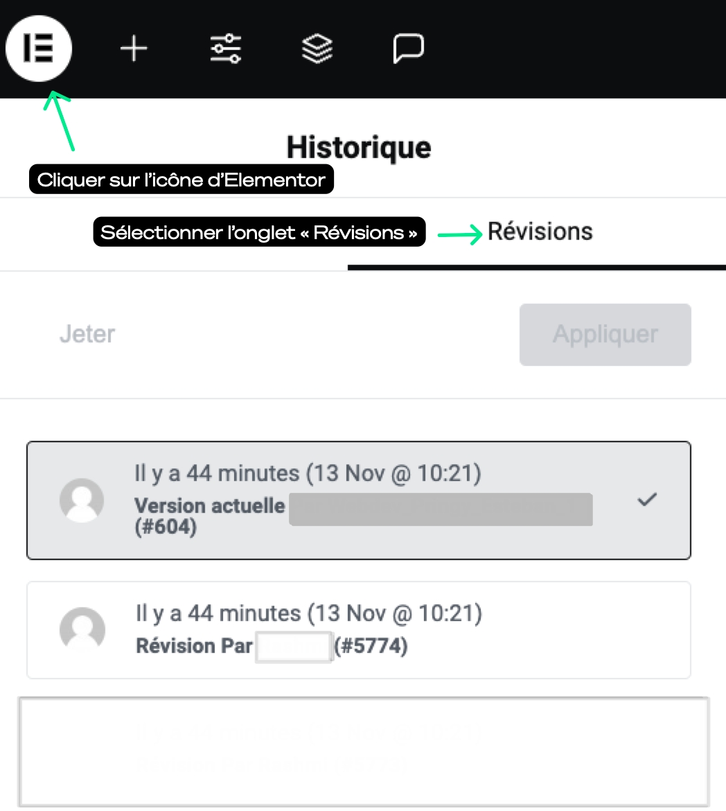 Lorsque vous travaillez avec Elementor pour modifier une page, il est possible de restaurer une version précédente si des erreurs ont été commises ou si vous souhaitez revenir à une version antérieure.