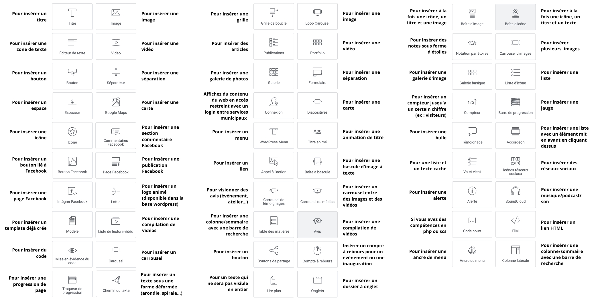 Sur Elementor, en cliquant sur + (Ajouter une nouvelle section), vous pouvez sélectionner votre structure, avec un certain nombre de section, et vous retrouverez les modules suivants :